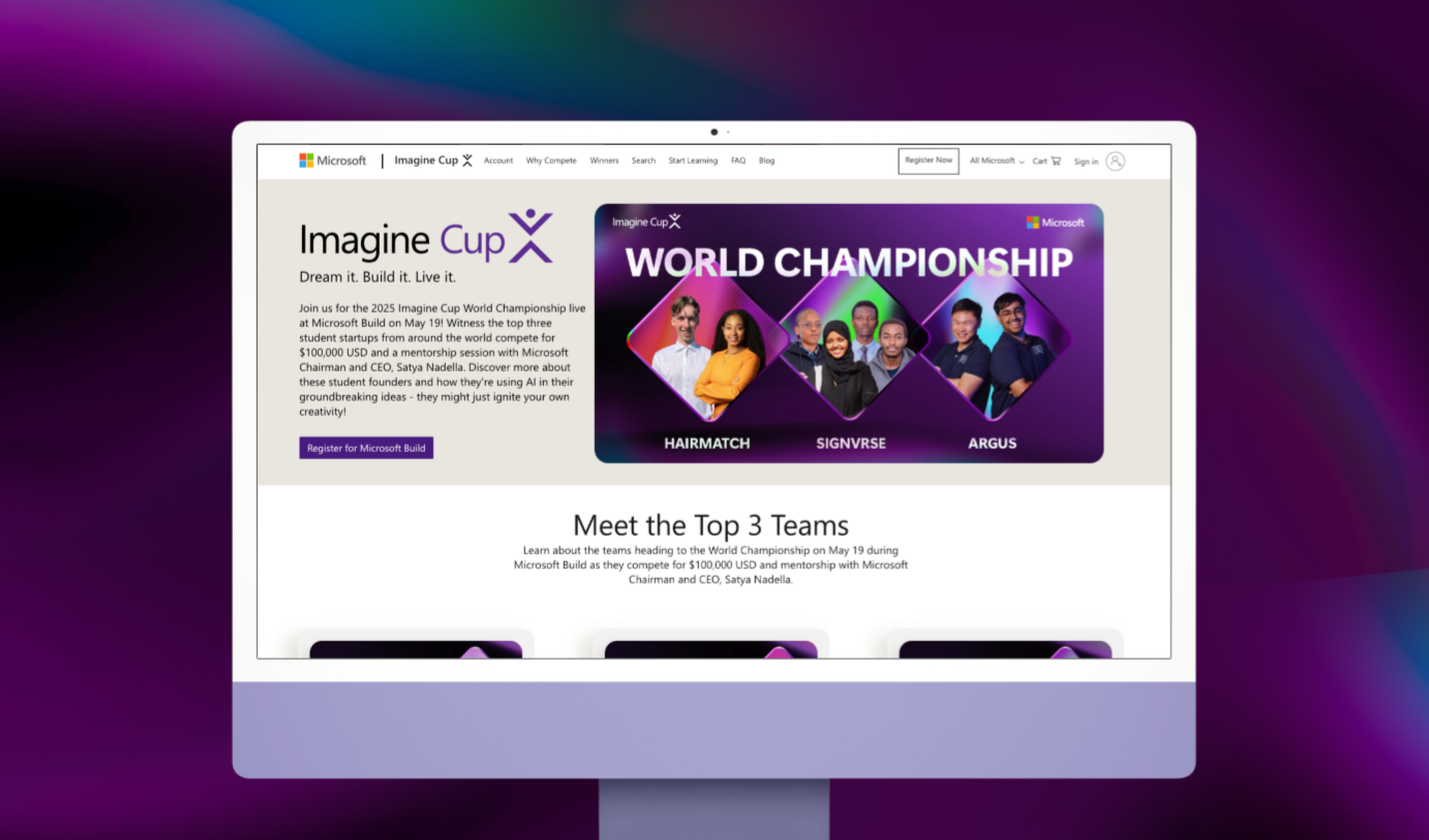 Overview: Imagine Cup is the global student developer competition that empowers participants to unleash their passion and purpose by creating innovative solutions to real-world problems. Each year, it debuts a fresh brand look to inspire and engage participants.